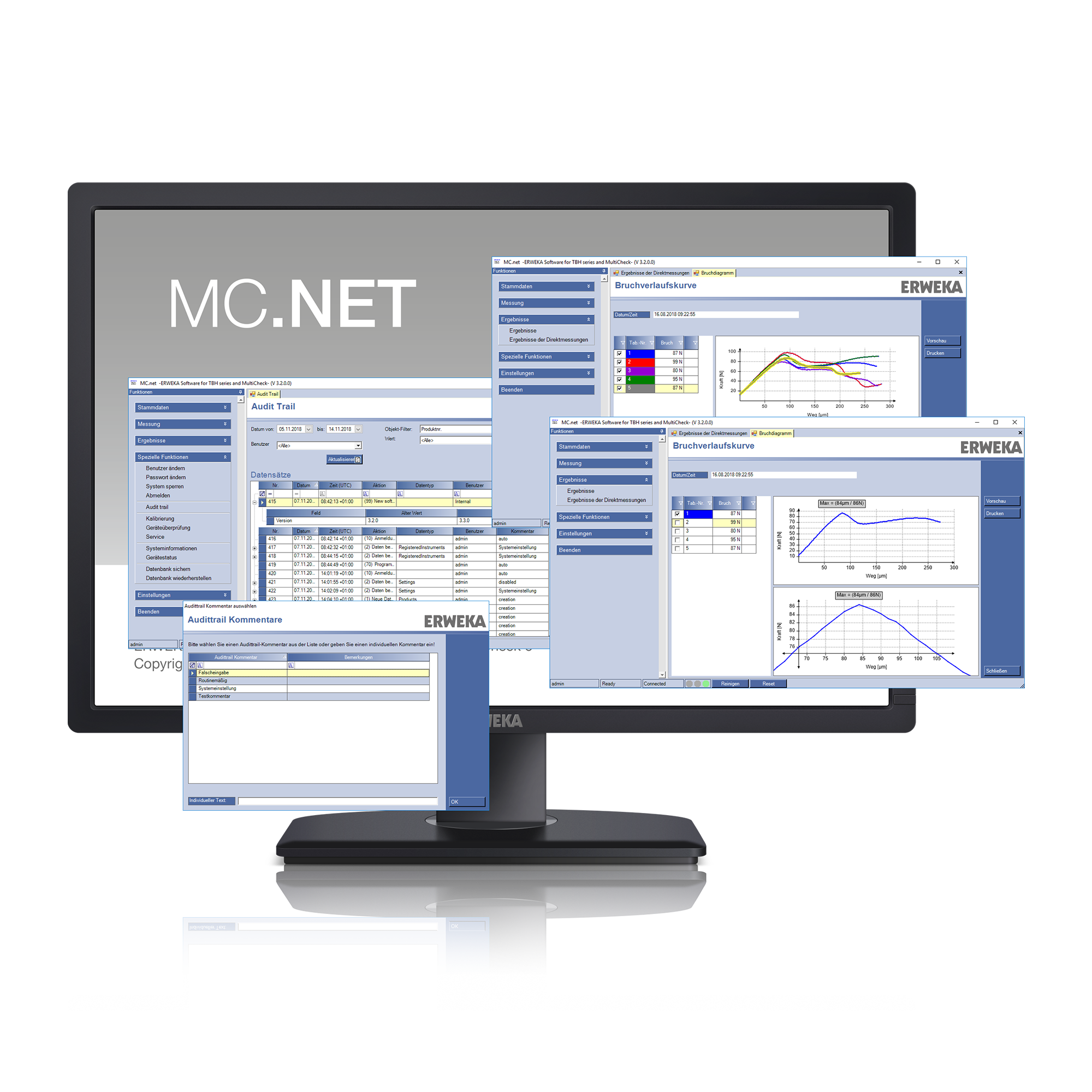 MC.NET and Export Manager are the ERWEKA software solutions for our Physical Tester. With the help of Export Manager, various equipment in the same network can export data to a PC where it can be stored either locally or in a network. MC.NET is the full software suite for our physical hardness tester – with Audit Trail, network database, method management and unlimited results storage.
